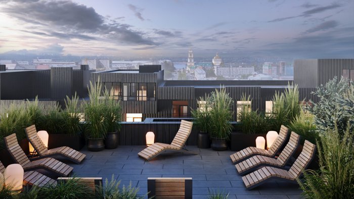 В «Грёнхольм» даже крыши будут благоустроены для отдыха жильцов. Здесь, на уровне 6 и 7 этажей будет открытая терраса, где можно посмотреть на город в лучах закатного солнца и отдохнуть наедине с собой.