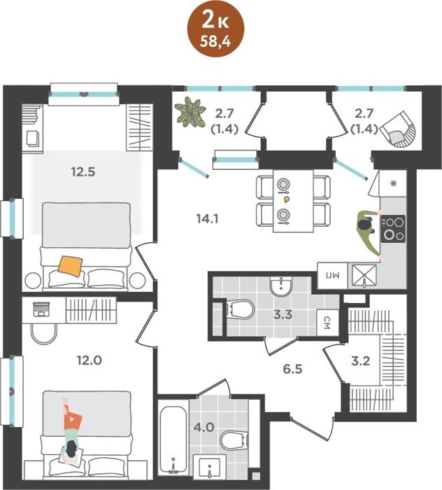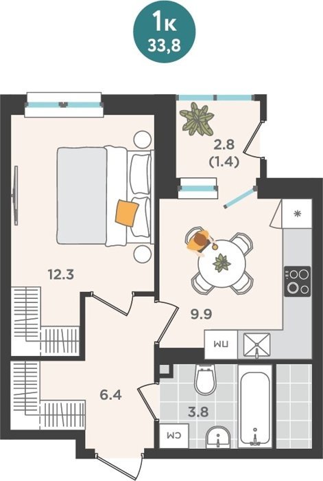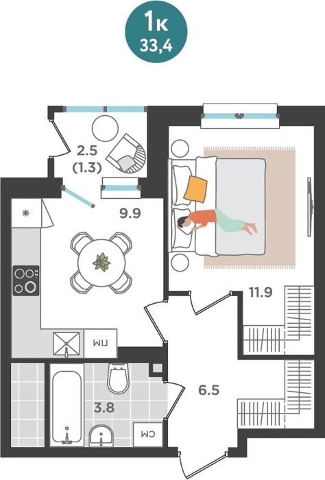 Площадь от 33.4 м2