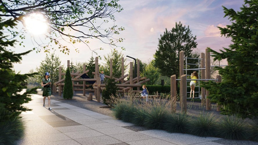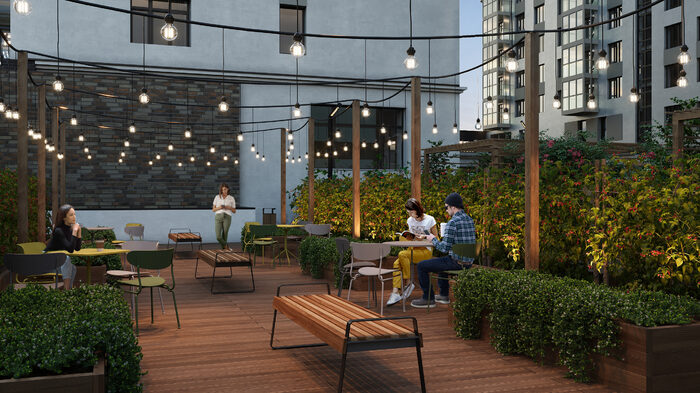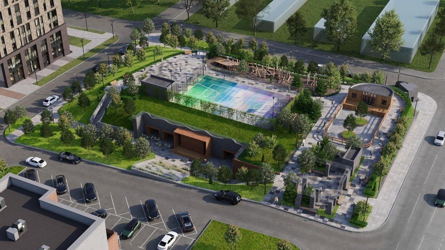 Пространство для жителей, расположенное на стилобате паркинга. Любуйтесь видом на реку с высоты, проводите время с близкими или работайте на свежем воздухе.